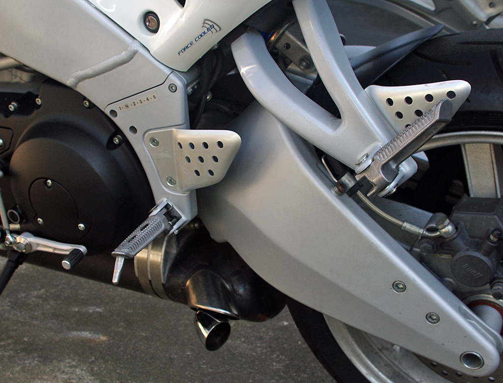 このBuell FIREBOLT XB9Rの出荷直前に、「排気口は後方を向いていないといけない!」と規制されたらしく、写真中央下のマフラーエンドを取り付けないと車検は通らない。さすがのErik Buell(エリック・ビューエル)も設計段階で、日本でそんなアホな規制が発動されるとは思いもよらなかったのだろう。これは付いているといかにも「取って付けた感」があって変だ。だから次のイヤーモデルからは標準で排気口が後方を向いた仕様になった。